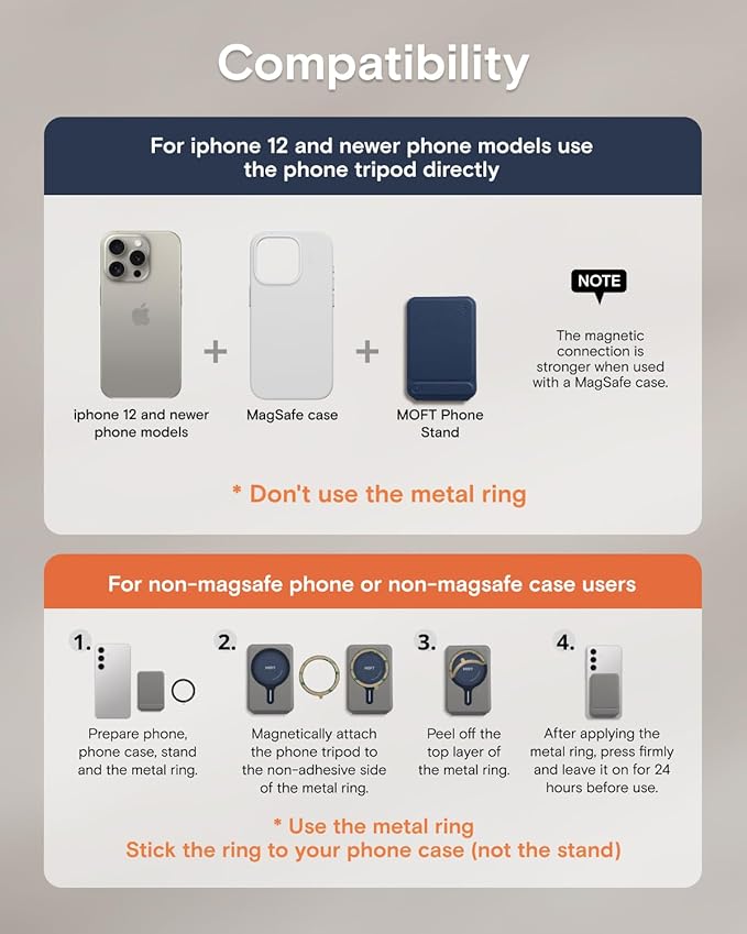 - Universal Compatibility: MOFT Phone Wallet is compatible with iPhone 17/16/15/14/13/12 series and MagSafe cases. For other devices (such as Samsung) and non-magnetic cases, the phone stand can be attached using the included metal ring. Please check the product dimensions (3.8in X 2.5in X 0.35in) to ensure it fits the back of your phone without obstructing the camera. The slim design ensures your phone’s lenses stay unobstructed—perfect for Instagram-worthy shots at cafes or business events.