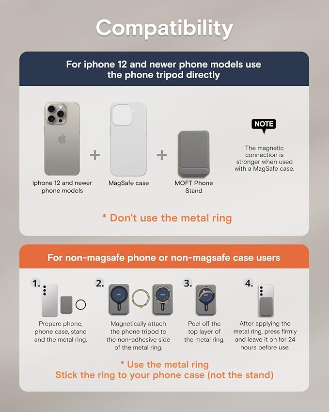 - Universal Compatibility: MOFT Phone Wallet is compatible with iPhone 17/16/15/14/13/12 series and MagSafe cases. For other devices (such as Samsung) and non-magnetic cases, the phone stand can be attached using the included metal ring. Please check the product dimensions (3.8in X 2.5in X 0.35in) to ensure it fits the back of your phone without obstructing the camera. The slim design ensures your phone’s lenses stay unobstructed—perfect for Instagram-worthy shots at cafes or business events.