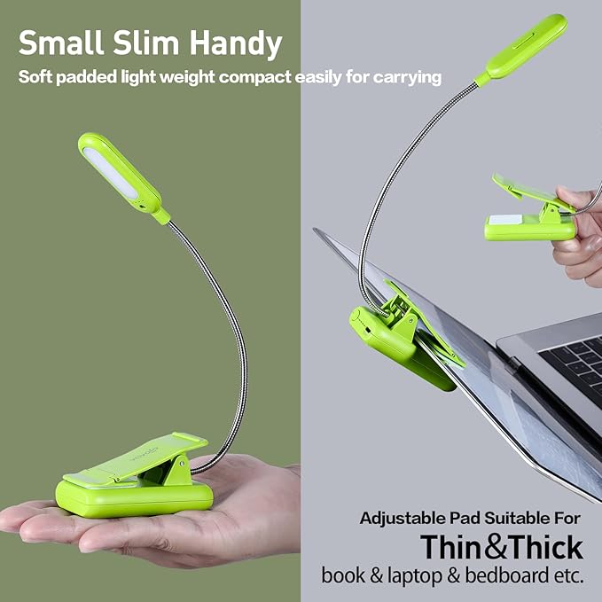- 【7 Led & 9 Color Temperature】This new pretty neon green book light is perfect for everyone which can increase their reading enthusiasm. Meantime, parents will also love the book lights when working, reading or accompany their kids. The reading light is equipped with 7 upgraded smd leds, 9 different color temperature modes: warm white(2800k/3000k/3200k), warm cool white(4000k/4500k/5000k) and cool white(6000k/6500k/7000k)