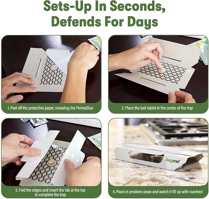 - Easy, Fast Setup Cockroach Trap: Pre-folded glue traps for a quick, easy, under-a-minute setup. Simply remove the adhesive covering, place the bait, fold the trap, and watch bugs collect inside