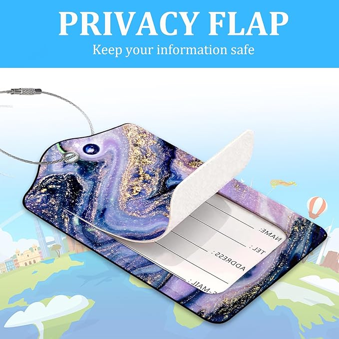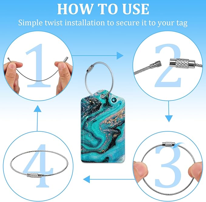 - REUSABLE MATERIAL:The Luxury Liquid marble luggage tags for suitcases are made of aluminum alloy material,rust resistance,durable to use.With 201 stainless steel wire rope,can rotate open,not easy to fade and break,very convenient to attach on your luggage.