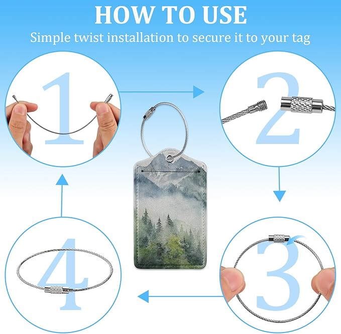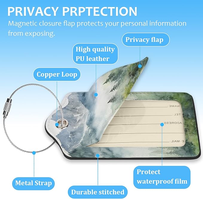 - REUSABLE MATERIAL: The Misty Forest luggage tags for suitcases are made of aluminum alloy material,rust resistance,durable to use.With 213 stainless steel wire rope,can rotate open,not easy to fade and break,very convenient to attach on your luggage.