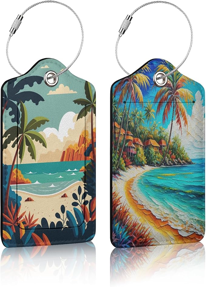 2 Pack Luggage Tag for Suitcase,Summer Beach Palm Tree Luggage Tag with PU Leather Privacy Cover ID Label & Stainless Steel Loop for Women Men Travel Bag Suitcase