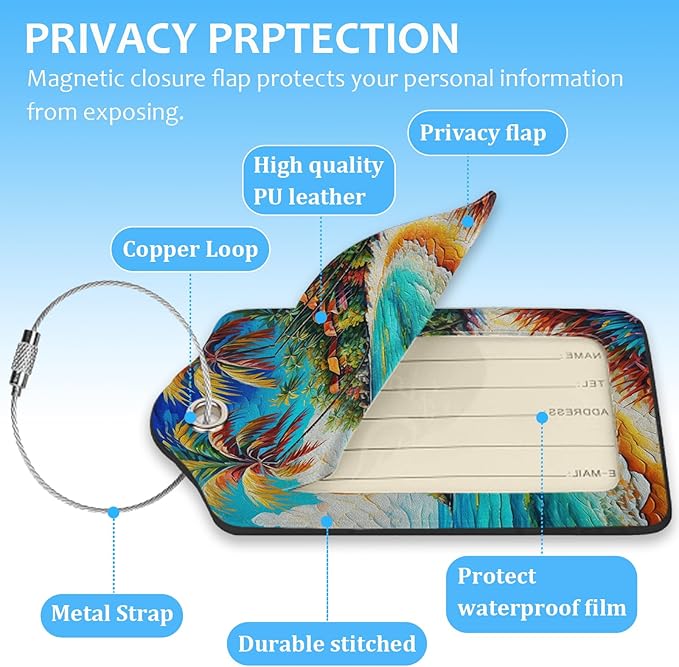 - REUSABLE MATERIAL: The summer beach Palm tree luggage tags for suitcases are made of aluminum alloy material,rust resistance,durable to use.With 216 stainless steel wire rope,can rotate open,not easy to fade and break,very convenient to attach on your luggage.