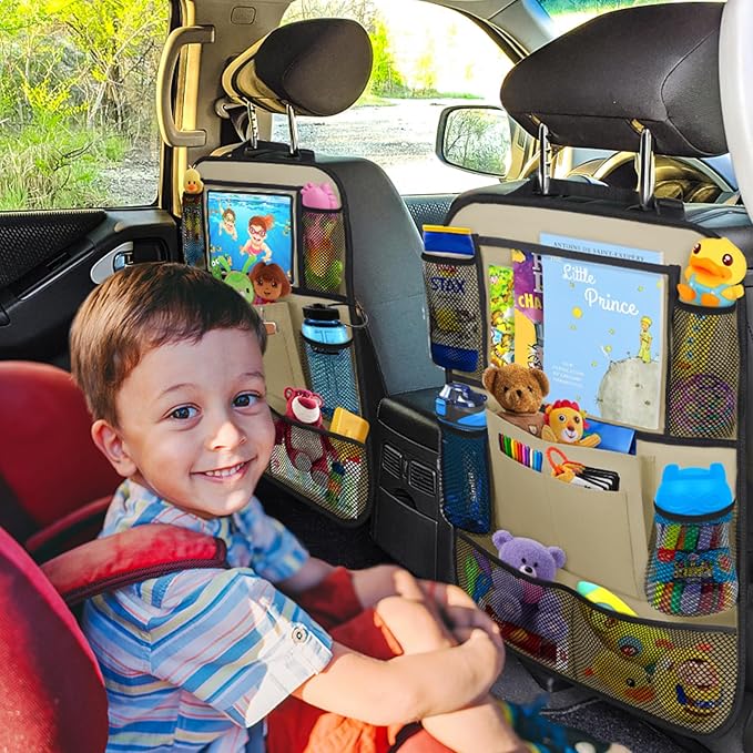 Car Backseat Organizer with 11" Table Holder, 10 Storage Pockets Seat Back Protectors Kick Mats for Kids Toddlers, Travel Accessories, 2 Pack, Beige