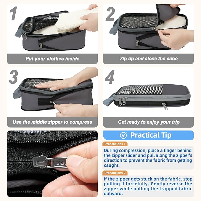 - HOW TO MAKE THE COMPRESSION HAPPEN? - There Is a Extra Zipper Outside Of Our Compression Packing Cubes Which Can Be Zipped Up To Flatten The Cubes And Save The Space As Far As Possible. It Just Works Like a Vacuum Sealer. You Just Need To :1) Fold Your Clothes And Flatten Them 2)Pack Clothes In The Cubes And Zip The Normal Zipper. 3)Put A Finger On The Back Of The Zipper In The Space When Compressing The Packing Cubes In Case The Zipper Get Stuck In Fabric.
