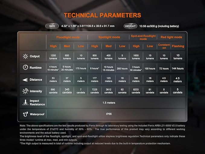 - VERSATILE MODES AND TEMPERATURE - A rotary toggle and an electronic switch grant easy access to eight white light modes and two red light modes. Another rotary toggle can adjust the color temperature of the floodlight.