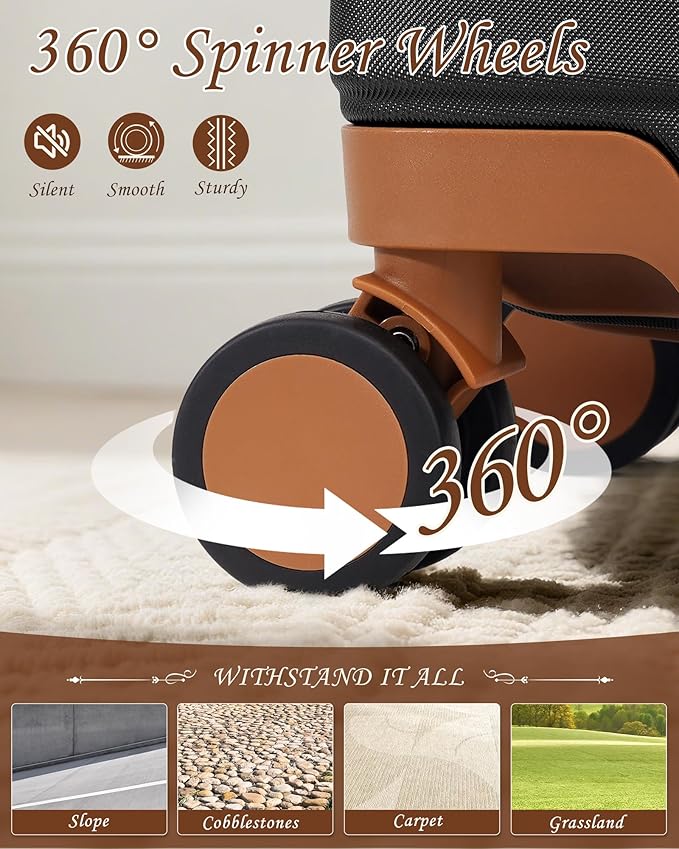- 【Durable & Smooth 360° Wheels】From airport sprints to cobblestone alleys, these library-quiet wheels glide smoothly in all directions. Rigorously proven through 90cm single-wheel drop tests and 16km extended runway sprint trials, they maintain flawless stability with 20kg (44lbs) loads—perfect for dodging crowds at busy terminals or tackling uneven urban terrain.