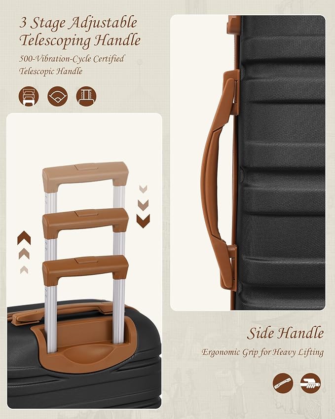 - 【3-Stage Smooth Adjustable Handle】The 3-stage telescopic handle adjusts smoothly and locks securely at any height, reinforced with steel for strength and stability—tested through 500 vibration cycles to withstand rough airport handling. Convenient side handles provide a secure grip when lifting into overhead compartments.
