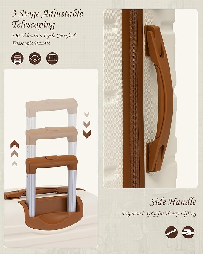 - 【3-Stage Smooth Adjustable Handle】The 3-stage telescopic handle adjusts smoothly and locks securely at any height, reinforced with steel for strength and stability—tested through 500 vibration cycles to withstand rough airport handling. Convenient side handles provide a secure grip when lifting into overhead compartments.
