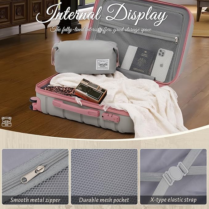 TAKUMI Carry On Luggage Set 3 Piece ABS+PC Hardshell Suitcases with Duffel Bag Double Spinner Wheels Travel Luggage with TSA Lock Lightweight Suitcase Set(GREY PINK, 3 PIECE SET(20/DB/TB))