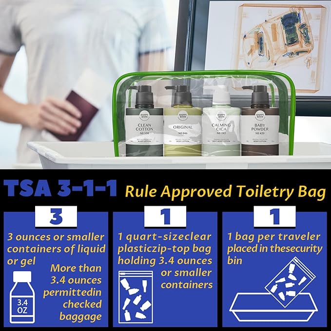 - TSA Approved Clear Toiletry Bag Carry-On Size: Our Bag Size of each is about 7.28"x 2.36"x 5.11"(18.5 X 6 X 13CM). Weight: 0.055lb/ 25.3g. you can carry them anywhere, the enough capacity is suitable to store your small items like lipsticks, eyeshadow and other things; These clear travel bags for toiletries strictly follow 3-1-1 liquids rules for carry-on bag of all airlines. Easy and quick to pass through airport security.