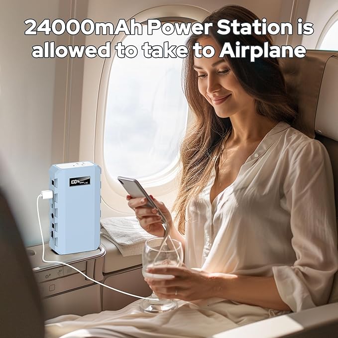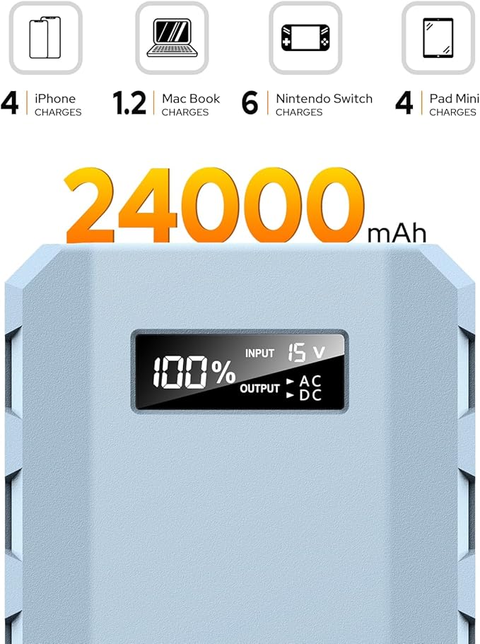 - 【LED Digital Display】The 24000mAh rechargeable power bank with ac outlet is equipped with a smart LED digital display, which can accurately record the remaining power level, making it easy for you to operate the power supply