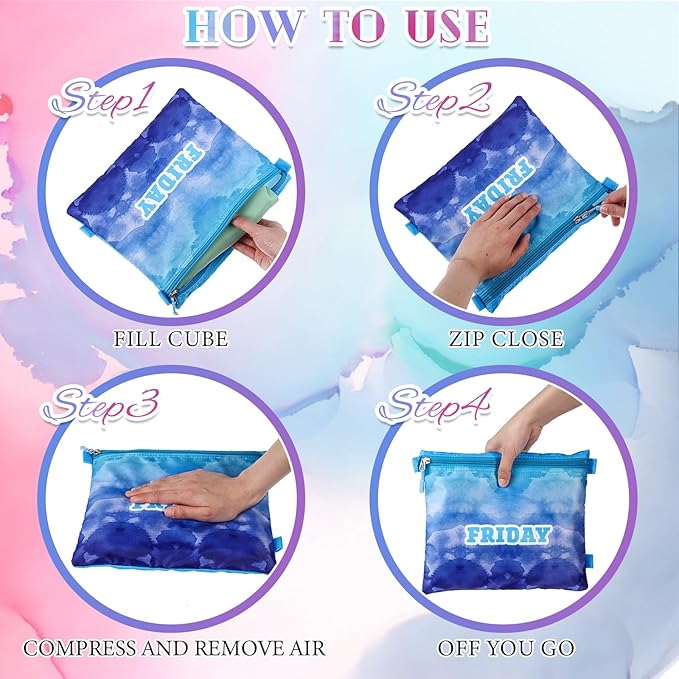 - Outfit for [ Every Day of the Week]: eachbag measures 10.75 x 9.25 inches, the surface is marked: monday, Wednesday, Thursday, Tuesday, Friday, Saturday and Sunday; With this set of luggage organizers, you no longer need to mark the date, not only will your suitcase stay clean and tidy, but the stylish print will ensure you feel happy when you open it