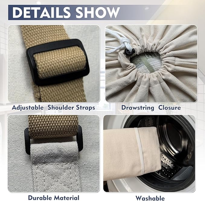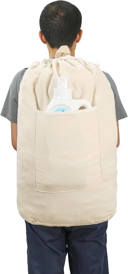 Canvas Laundry bag, Washable Laundry backpack, Adjustable Straps, Large Front Pocket, Drawstring Closure (BEIGE, X-Large)