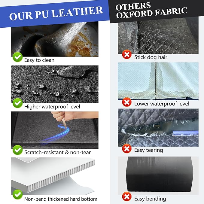 - 【UPGRADED STURDY FAUX LEATHER】ROUWINNE backseat extender for dogs is made of upgraded imitation leather, which is softer and more wear-resistant and scratch-resistant than Oxford cloth. No need to worry about being scratched by pets. At the same time it is better in waterproof, cleaning also more convenient and quick, do not have to worry about dirt sticking in the cover, it is easier to clean.