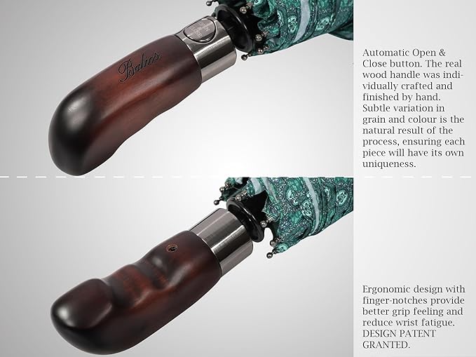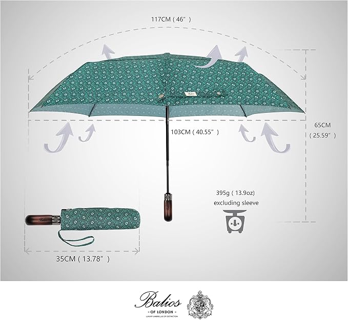 Balios Travel Folding Umbrella with Real Wood Handle Auto Open Close Vented Windproof Canopy - Designed in UK
