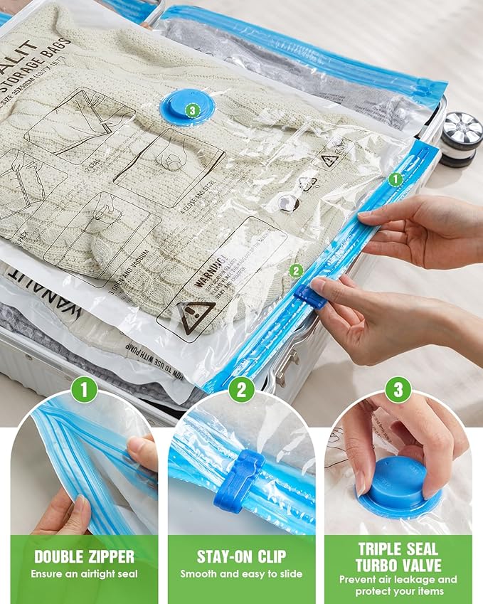 - 【Create Air-tight and Waterproof Seal】Designed with double zip seal and triple seal turbo valve, which can ensure the vacuum tightly sealed. leading to high levels of protection as well as higher efficiency in storage. Great to protect your valuable belongings from being ruined !