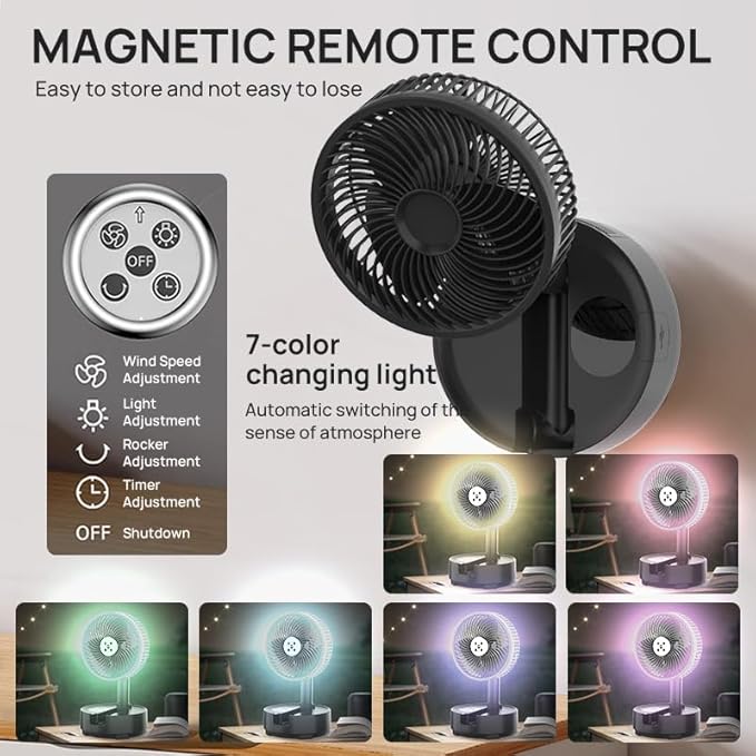 - LED lights and remote control: The Onnilife portable fans with LED lights come with built-in LED colorful lights, with multiple modes for adjustment and color switching to add ambiance to your home or outdoor space. Use the detachable wireless remote control to adjust fan speed, oscillation, and light on/off. Create your own cozy space!