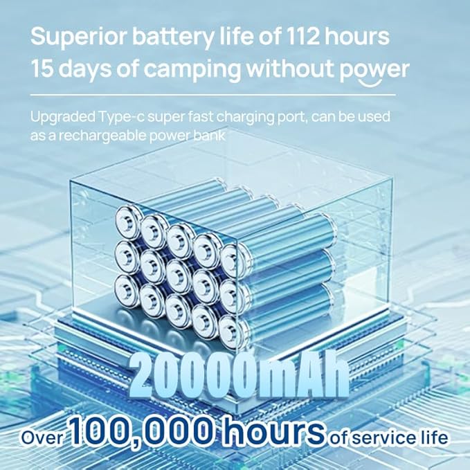 - Powerful battery life: Each charge can provide up to 12-112 hours of cool air. This 20000mAh high-capacity battery can also act as a power bank, charging your phone and other devices via the USB-C port. Bring your portable rechargeable fan on outdoor trips or camping, and even charge your phone outdoors. It's the ideal rechargeable camping fan for all your adventures.