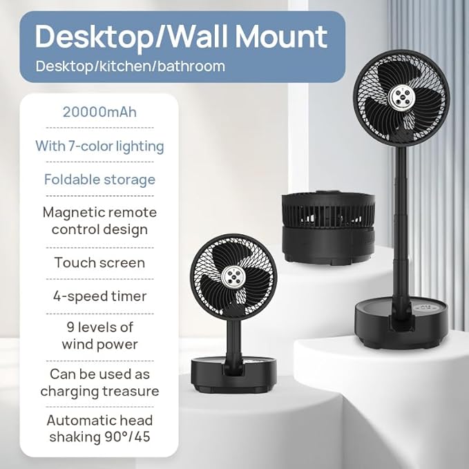 - Completely wireless: The Onnilife mini wireless oscillating fan keeps you cool anytime, anywhere! No power source? No problem! It's the most stylish foldable rechargeable fan in the world, powered by a rechargeable battery to keep you cool. The Onnilife portable foldable fan has 9 adjustable fan speeds to meet the continuous speed adjustment needs in various temperature environments. It can operate at a low noise level below 30dB, ensuring that you won't be disturbed during work, study, or sleep.