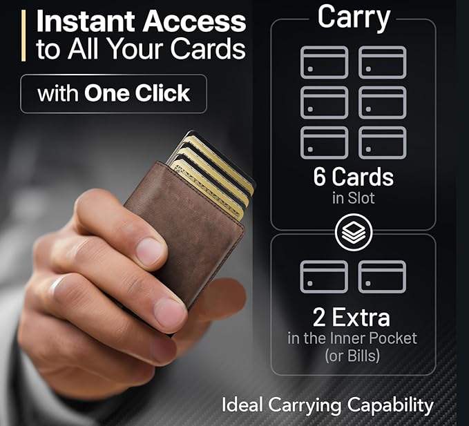 - 【Quick Access】: Our front pocket wallets for men include an improved ejection button to quickly access your cards. Our RFID card holder, holds up to 6 cards in the metal compartment and an extra 2 cards in inner pockets. Actual capacity may vary based on card thickness.