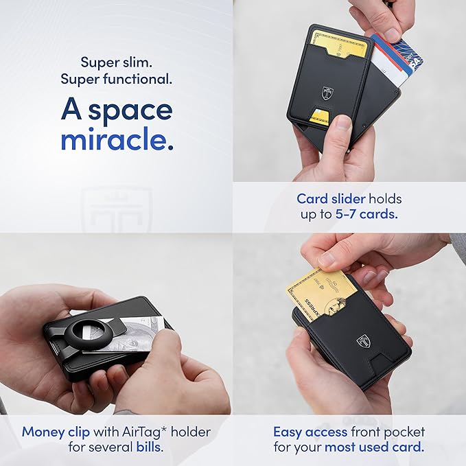 - ๐๐๐๐๐๐๐๐๐๐, ๐๐๐ ๐๐๐๐๐๐๐๐ - This slim wallet for men holds up to 6-8 cards (depending on card thickness) and fits seamlessly into your jeans, suit pants, blazer or shorts pockets with its trim dimensions of only 3.8 x 2.6 x 0.78โ and light weight of 3.99 oz. The stainless steel money clip allows you to clip folded bills securely on the backside of your credit card holder