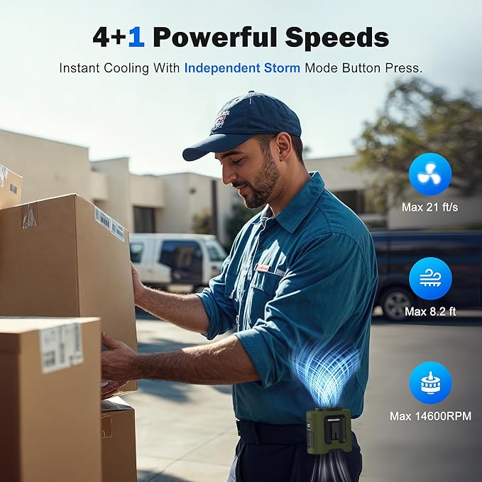 - 【4+1 Powerful Speeds at Your Command】With 4 adjustable wind speeds and 1 independent storm mode button, this jobsite fan is equipped with a high-speed brushless motor that can reach up to 14600RPM, delivering a powerful 21ft/s airflow for instant cooling. Perfect for workers in high-temperature environments who require strong, reliable airflow