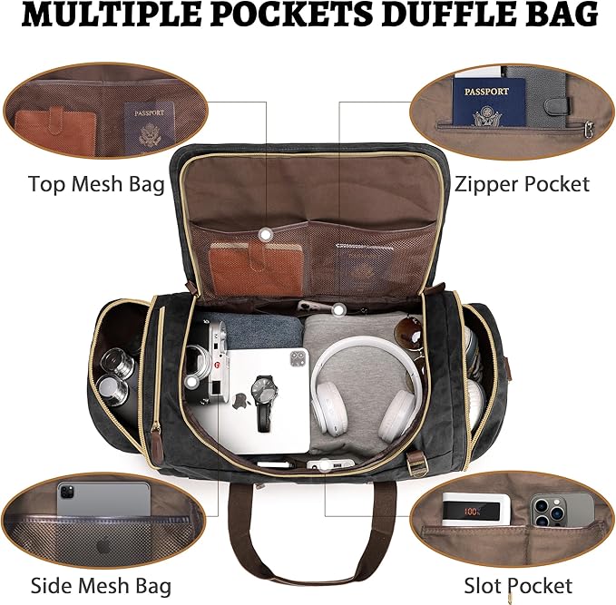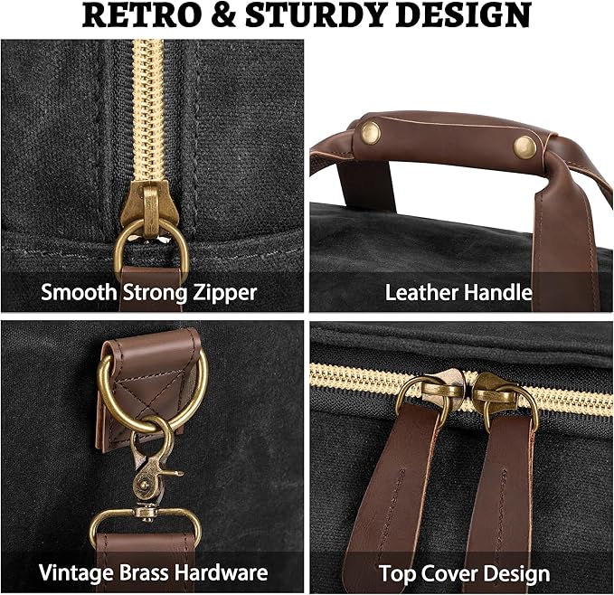 50L Duffle Bag for Men, Nomad Waxed Canvas Travel Duffel Bag Vintage Genuine Leather Travel Handbag Upgraded Weekender Overnight Backpack with Shoes Compartment (Vintage Black, Large-50L)