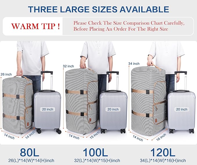 - [ Foldable & 120L Extra Large Capacity Duffle Bag ] : It expands to 34 x 14 x 16 inches, has a capacity of 120 liters, weighs 1.9 pounds and can be fast folded into itself with a compact size of 14" x 10" x 3", only 1/18 of a regular size luggage. Always take this folding duffle with you on any trip, open up when you need to carry gifts for your friends, or to transfer stuffs from your damaged luggage.