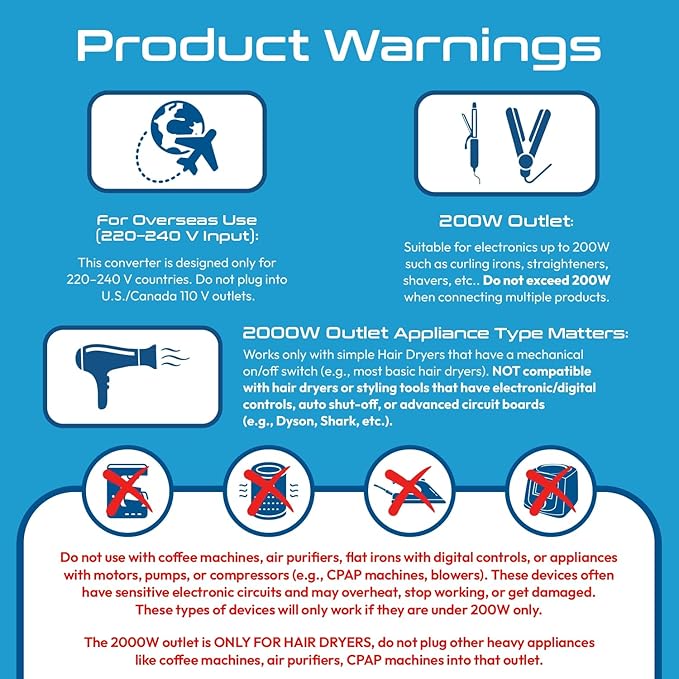 - [Safety Certified]: Our travel adapter and voltage converter feature a Silent Fan to prevent it from overheating, Auto Shut Down Surge Protection, Over Current, Over Temperature, and Short Circuit Protection, protecting your devices from overload. NOTE: Some hairdryers may not be compatible with voltage converters. We recommend checking your hairdryer's voltage and usage instructions before using it with a converter to ensure safe and proper operation.