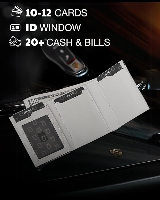 - 【 RFID Blocking Security 】 In today's world, identity theft is a growing concern. Jenoss comes equipped with cutting-edge RFID-blocking technology, creating a secure barrier around your credit cards, IDs license, and other sensitive information, ensuring your data remains safe from electronic pickpocketing. This protective feature makes it a must-have men's wallet for the alpha mens.