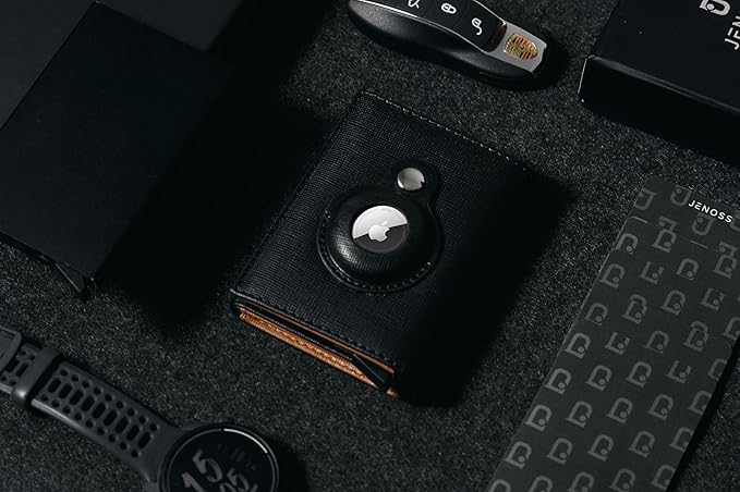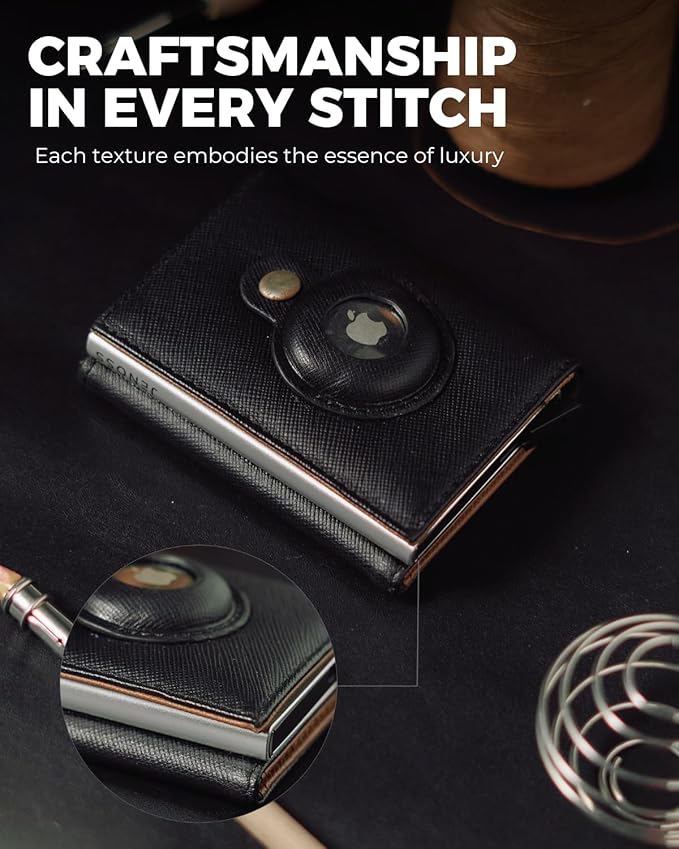 - 【 100% Full Grain Saffiano Leather 】 Handcrafted from Finest Italian Vegetable Tanned Full-Grain leather, known as "the sapphire of genuine leather" (made from top layer of the cowhide, commonly found in premium fashion) treated with wax for a subtle shine, silver accents, over time, Jarvis wallet surface will develop a unique patina—a hallmark of high-quality real leather. We believe that an exquisite Air-Tags wallet can only be crafted by using the finest materials and masterful craftsmanship.