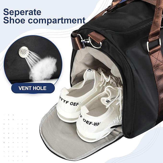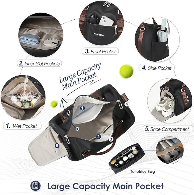 FIORETTO Womens Gym Tote Duffle Bag with Toiletry Bag, Sports Duffel Overnight Hospital Workout Carry on Bag for Girls with Wet Pocket & Shoe Compartment, Ideal for Travel, Swimming, Black & Brown
