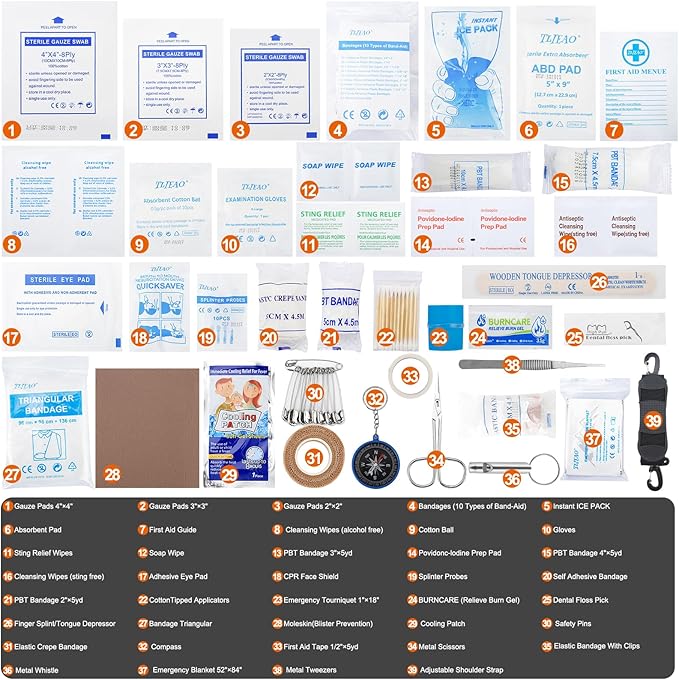 - Emergency Essentials: This kit has everything you need! Fully packed with 430 professional medical supplies - all kinds of bandages, gloves, povidone-lodine prep pad, tourniquet, etc. with such items you can get ready for unknown situations better.