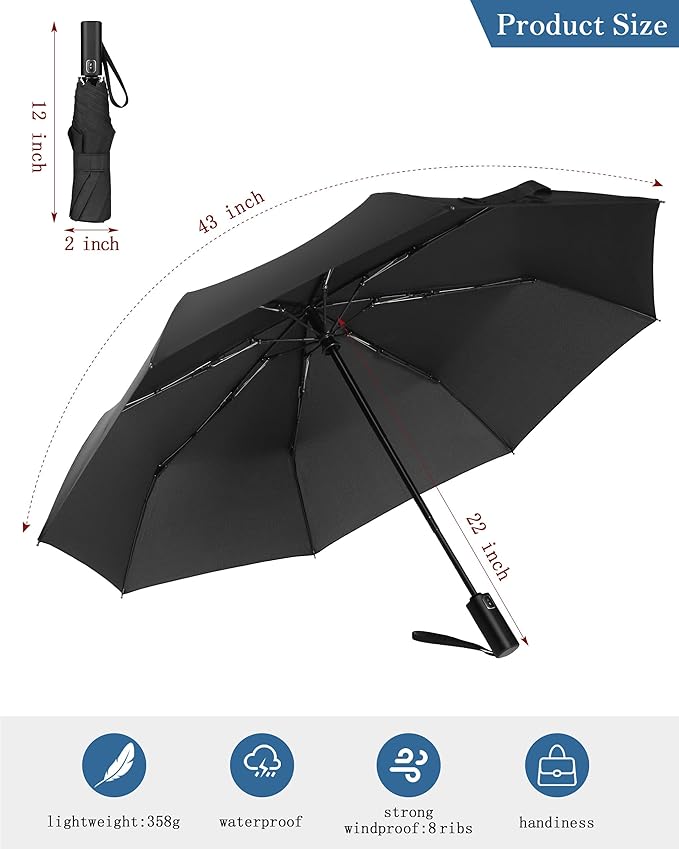 - Excellent wind resistance: Our windproof travel umbrella features a sturdy frame made of eight fiberglass ribs, designed to withstand strong winds. Its lightweight, foldable design is ideal for travel, providing reliable wind and rain protection in any travel scenario