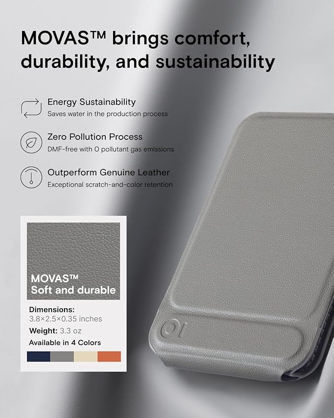 - 3-in-1 & Eco-friendly: This everyday carry features a phone tripod, phone stand and phone wallet with a simple fold to transform. It folds into an 8" phone tripod stand in a second. Crafted with the pioneering water-based MOVAS Vegan Leather, it's smooth to the touch while saving water from the manufacturing process.