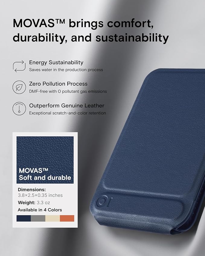 - 3-in-1 & Eco-friendly: This everyday carry features a phone tripod, phone stand and phone wallet with a simple fold to transform. It folds into an 8" phone tripod stand in a second. Crafted with the pioneering water-based MOVAS Vegan Leather, it's smooth to the touch while saving water from the manufacturing process.