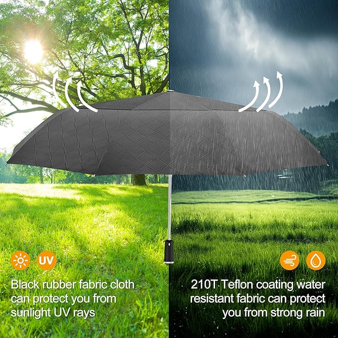 - 【High Quality & Unique Design】SATOL oversize windproof golf umbrella has a wide canopy that provides abundant coverage. The travel umbrella is large enough to protect 2 people from the rain. The folding umbrella is made of a 210T pongee fabric that is fully water-resistant. This UPF 50+ anti-UV fabric also gives you optimum protection during the hottest days.