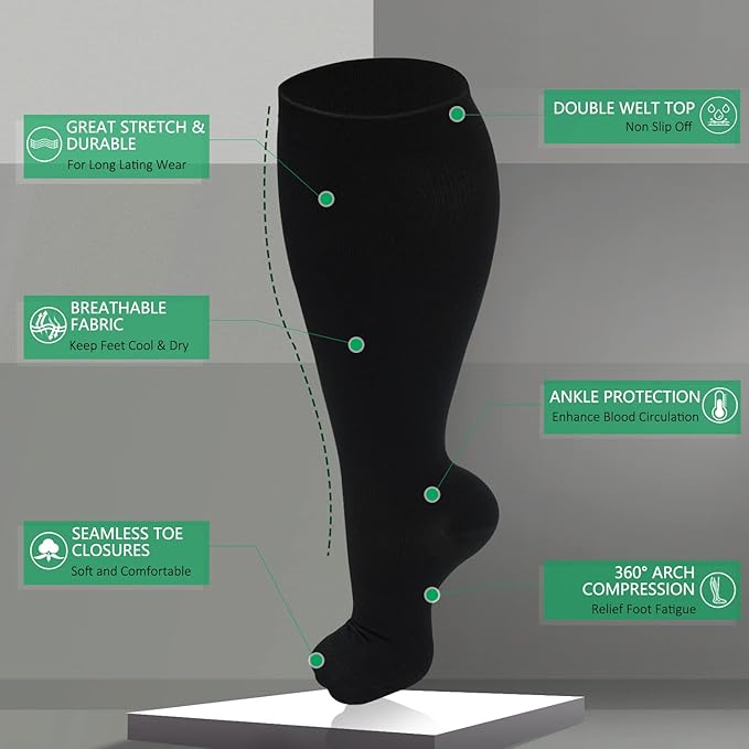 - 【WIDE CALF DESIGN】- NEW FIT Extra Wide Calf Compression Socks, specially designed for women and men who wear in exlarge or plus size, bring your legs strong support and long lasting comfort. We provide more size choices (XL-5XL) for ankle up to 18 inches, calf 10 to 30 inches’ circumference, you can refer to the size chart to choose the suitable size.