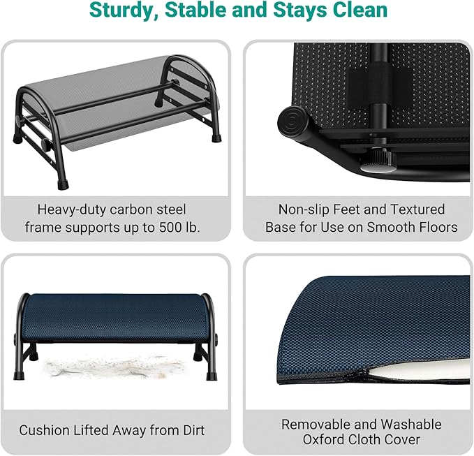 - 【Adjustable Design】Under desk foot rest for office has 4 height and 2 angle positions to fit people, desks, and chairs of all heights. Product size: 19.2”L x 12”W x 4-10”H.