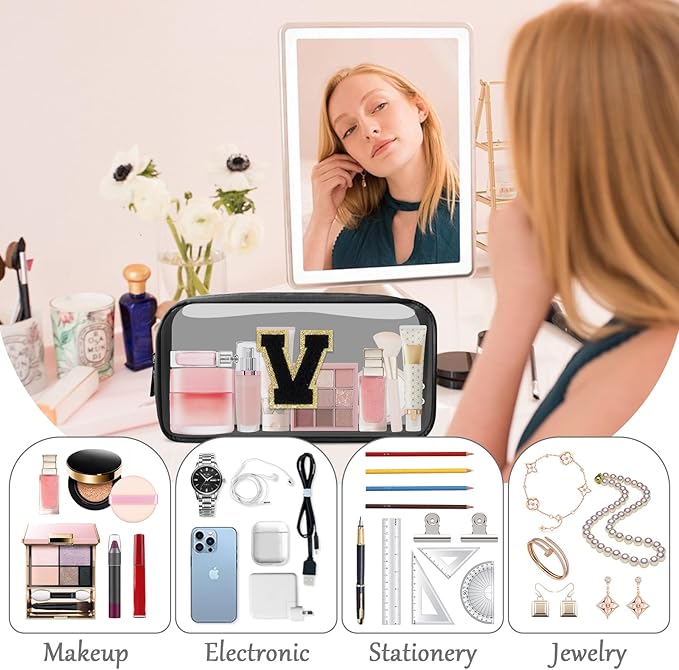 Personalized Initial Letter Clear Makeup Bag,Preppy Small Nylon&PVC Cosmetic Zipper Bag with Chenille Letter,Travel Skincare Toiletry Bag,Monogram Christmas Gift for Teen Girls Women,V