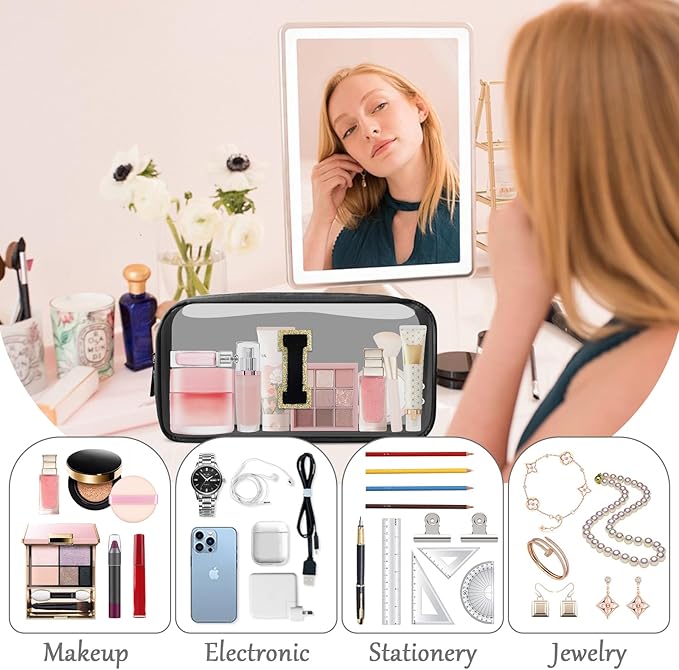 - 【Chenille Letter Patch Bag】Preppy initial makeup bag with professionally sewn chenille letter patches. You don't have to worry about them falling off. With its waterproof nylon & PVC design and unique glitter A-Z initials, it will surely stand out from all your makeup bags, brighten your mood and highlight your personality.