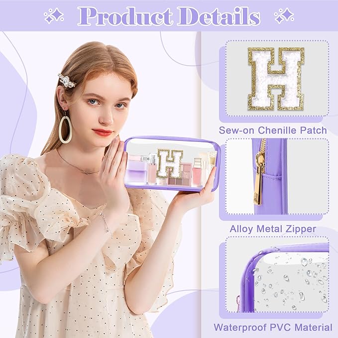 - 【Chenille Letter Patch Bag】Preppy initial makeup bag with professionally sewn chenille letter patches. You don't have to worry about them falling off. With its waterproof nylon & PVC design and unique glitter A-Z initials, it will surely stand out from all your makeup bags, brighten your mood and highlight your personality.