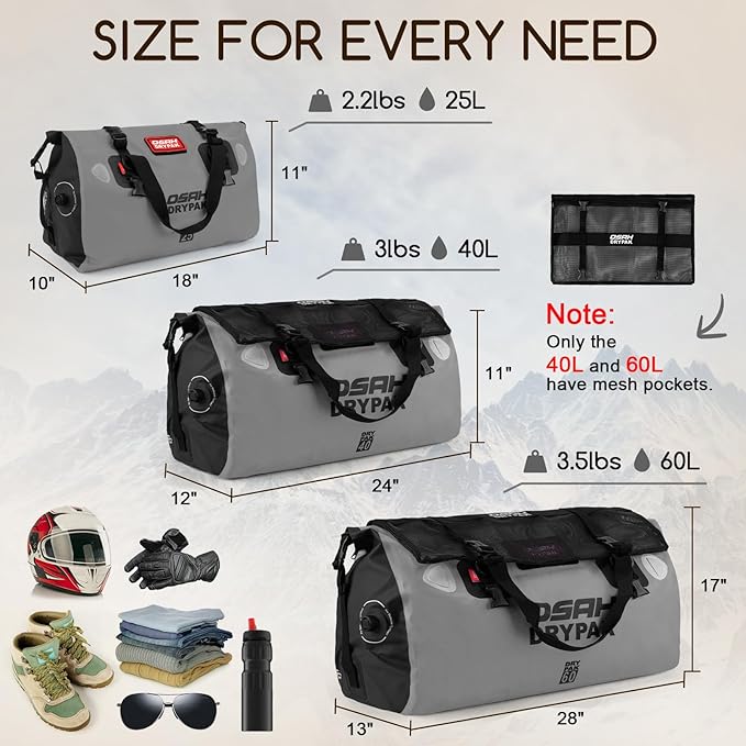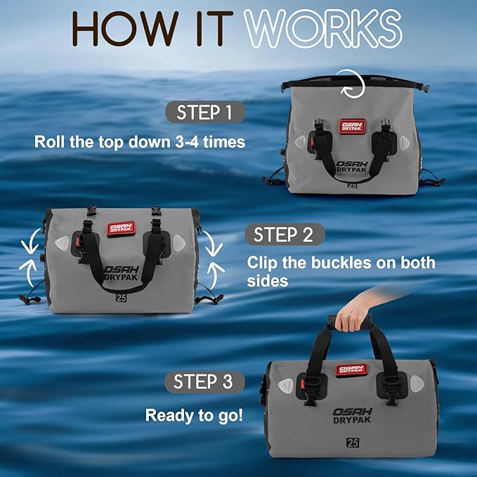 - WATERTIGHT PROTECTION: OSAH DRYPAK duffel bag is made of durable high-strength PVC, which is completely waterproof & snowproof. Ideal weekender bag for all your sailing, fishing, camping, sporting, boating, and motorcycling travel adventures.