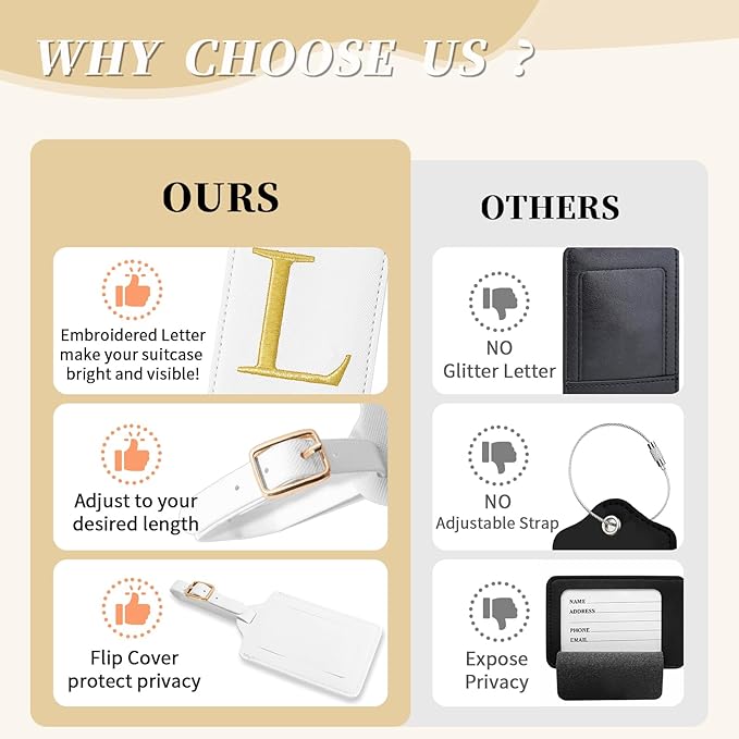 - ✈【Embroidered Initials Luggage Tag】Cute exquisite A-Z personalized luggage tag for suitcases with gold border glitter embroidered letter patch, the letters are made from carefully stitched gold-colored thread.Firmly sewn to the tag, you don't have to worry about them falling off. Bright gold letters and vibrant luggage tag colors to help your suitcases be more easily recognizable at baggage claim.Monogram travel tags make your luggage more personal.