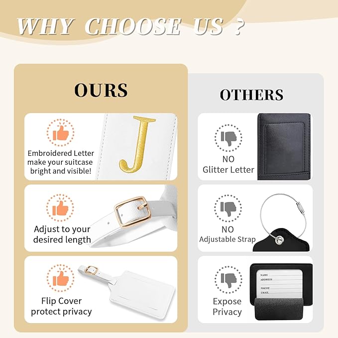 - ✈【Premium Materials】Durable costom luggage tags are made of high quality PU leather, soft and slim, not easy to deform, suitable for long-term reuse! The front of the baggage tag is stitched with bright gold initials A-Z and the sides are sewn with silk thread, able to withstand the wear and tear of extended use and travel. And there is a thick piece of clear PVC under it, so luggage tag has a certain waterproof effect in rains (not underwater).