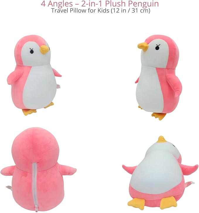 - ✅ 2-in-1 Plush Travel Pillow – Transforms from a supportive kids’ neck pillow into an adorable pink penguin plush. Perfect for travel by plane, car, or stroller.