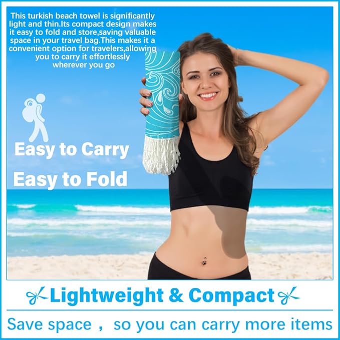 - LIGHTWEIGHT AND COMPACT:This turkish beach towel is significantly light and thin.Its compact design makes it easy to fold and store,saving valuable space in your travel bag.This makes it a convenient option for travelers,allowing you to carry it effortlessly wherever you go