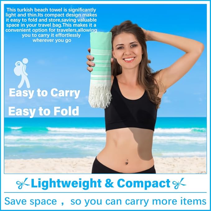 - LIGHTWEIGHT AND COMPACT:This turkish beach towel is significantly light and thin.Its compact design makes it easy to fold and store,saving valuable space in your travel bag.This makes it a convenient option for travelers,allowing you to carry it effortlessly wherever you go